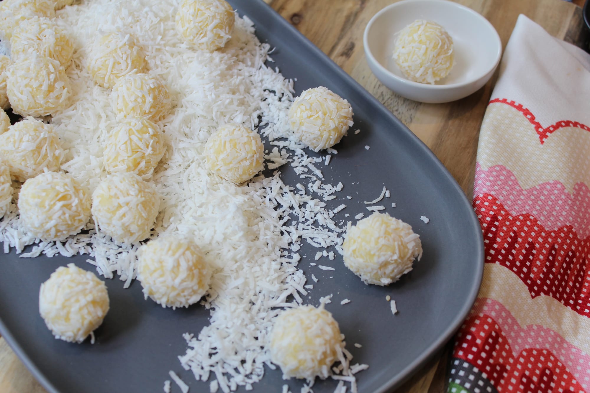 - 1 ½ cups unsweetened desiccated or shredded coconut, to coat